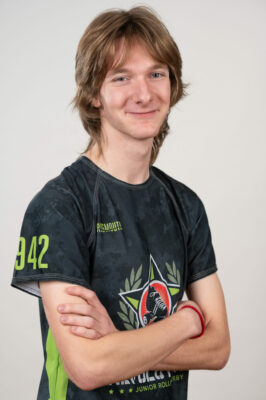 Sixteen-year-old Jonas Helmick (“Bacon Lil Hearts”) learned to roller skate at age five and played with Southside since age 8. He got his derby name from “Roller Girl,” a graphic novel by Victoria Jamieson, which he found highly influential. “Bacon” believes this sport can help discover who you really are and provides a place to push and find your own true limits. “Roller derby has given me the confidence to fully express myself and be the person who I want to be,” he said, “without feeling the overwhelming need to conform to what others want me to be. And in my opinion, nothing is more valuable in this world than being your own person.”