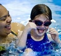 John Frashauer Jordan Rumple-White and swim instructor Tiffany Jordan share some laughs during a