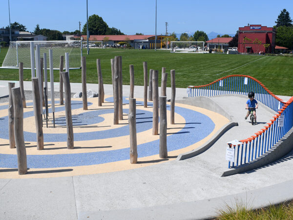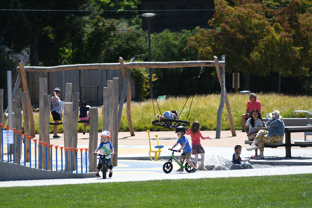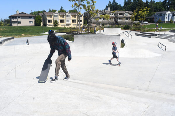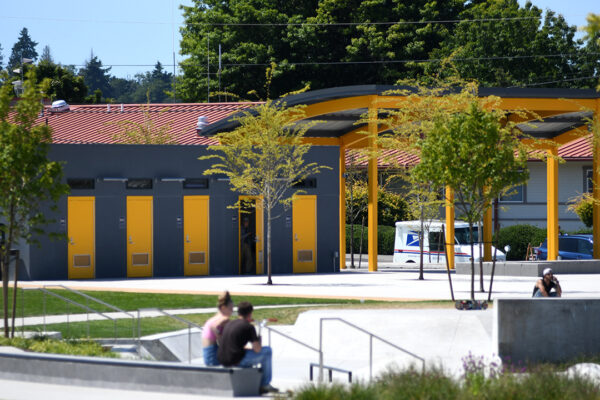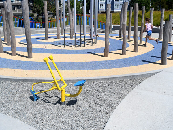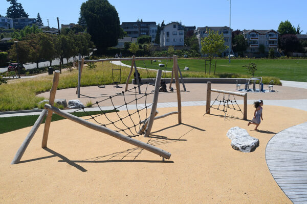 In addition to the inclusive playground, the park features a skate park, an athletic field, sports courts, petanque courts and a peekaboo view of the Olympic Mountains. Six single-stall restrooms are located next to the plaza. There’s a walking trail with exercise stations around the park.
