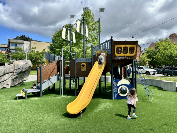 A pirate ship has washed ashore at the Commons Park in Ballard. Kids can channel their inner pirate at this nautical-themed playground. Climb aboard using various rope climbers or stairs. The play cannons, binoculars, and spinning steering wheels inspire creative play. Jump ship by gliding on the Track Ride for a thrilling exit. One can also abandon ship by sliding down the fireman’s pole or big yellow slide. A wide age range can explore under the deck, where there are several mini hammocks, a bubble window, and a treasure box. Once off the ship, kids can explore the turf playground by climbing a large rock, sitting in the Spinner Bowl, playing on the smaller play structure with slides, and bouncing on an old-school Springer Sea Lion. This park has excellent sight lines for the skate bowl and spray park. The playground has a partial border of wall seating adorned with metal shells. Cool off at the spray park, starting May 25 through September 2, from 11 a.m.-8 p.m. daily.