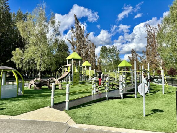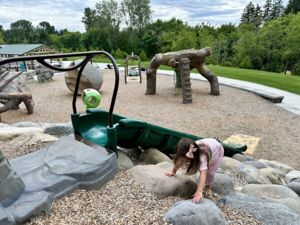 Snoqualmie’s newest playground (but not for long — watch out for the new splash pad at Snoqualmie Community Park opening this summer!) is inclusive for all abilities and almost entirely enclosed by a fence. A We-Go-Round and We-Go-Swing make it possible for all to play. The playground is divided into two sections, with the smaller one designed for 2 to 5-year-olds. On the other side of the sidewalk that cuts through the two sections is the area intended for kids ages 5 to 12. While each side is designated for suggested age groups, my children (ages 3 to 7) darted back and forth, exploring everything each side had to offer. Kids will find engaging musical and tactile elements throughout the playground, such as braille boards, slides, climbing and balance challenges, ramps, and a saucer swing. This playground sparks my children to run the maze of ramps and slides, and they most likely end up in a game of tag.