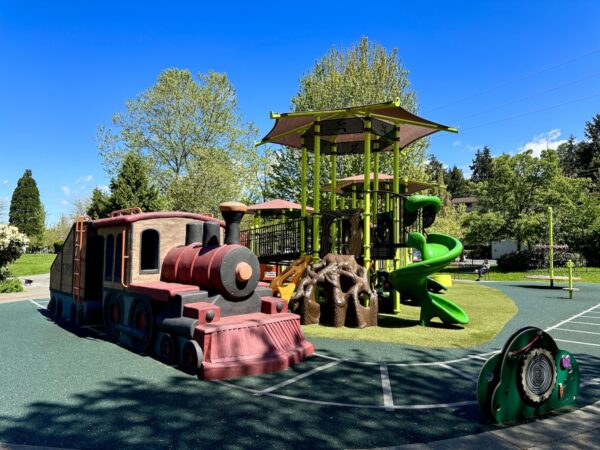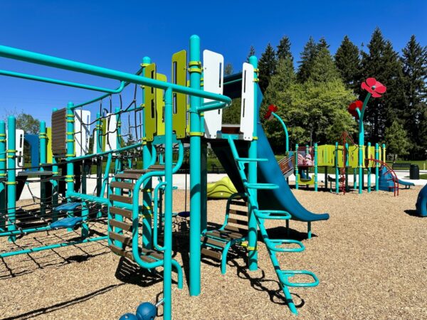 This colorful playground is sure to brighten anyone’s day. While it may initially look like it’s built for older climbers, younger toddlers can enjoy the small hills, musical components, cone spinner, and tiny swings under the playground structure. They can also walk along the small climbing squares and warm up their skills on the mini structure toward the back of the playground. The circular climbing nets and my kid’s favorite park feature, the “elevator,” are reminiscent of another favorite park of ours—Surrey Downs in Bellevue (built by the same company). Bring scooters or small bikes for the flat paved loop surrounding the playground. The community picnic table is a robust 48-feet-long.