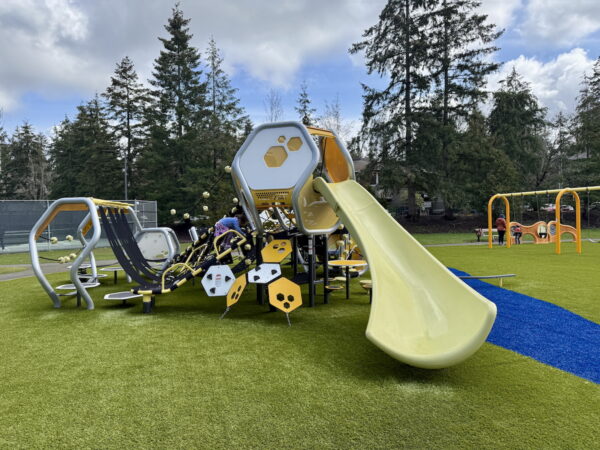 This playground refresh is as sweet as honey! With turf surfacing, all ages can comfortably explore the honeycomb-themed playground. Sensory panels, a butterfly bouncer that made me reminisce about my childhood, baby swings, and a small play structure separate from the larger one, make this playground inviting for the youngest children.