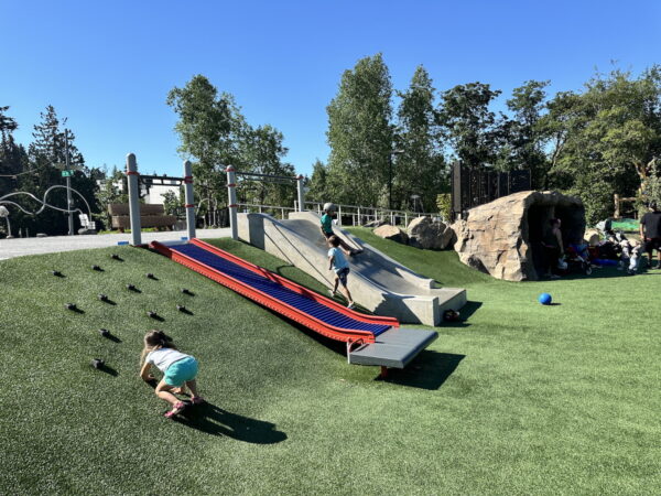 This smaller Bellevue Park is a climber’s dream! Older children can climb through the striking “bamboo forest” and explore many climbing obstacles. Crawlers and toddlers can safely explore the smaller play structure with forgiving turf surfacing and some sensory panels at low heights. A small hill toward the back of the playground begs to be rolled down. A Spinner Bowl and two saucer swings border the back edge of the park. Seat walls surround the playground for places to sit back and watch or have a snack. Bring some balls, frisbees or a picnic to spread out on the green lawn area just outside the playground footprint.