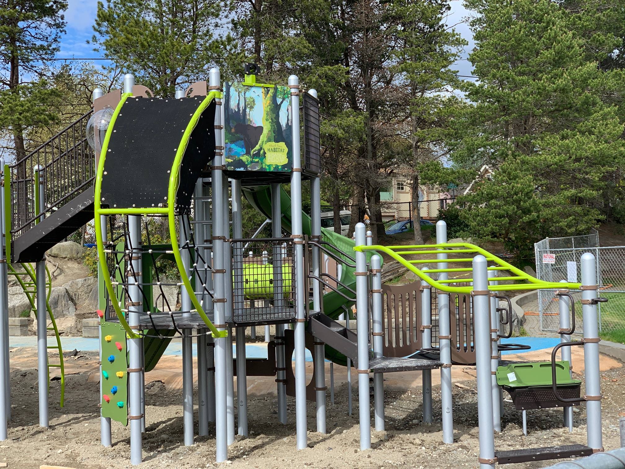 The new playground has all the classics: monkey bars, fire pole and sandbox. New bells and whistles include musical equipment and a multi-rider Oodle swing! Anticipated opening is now July 4.