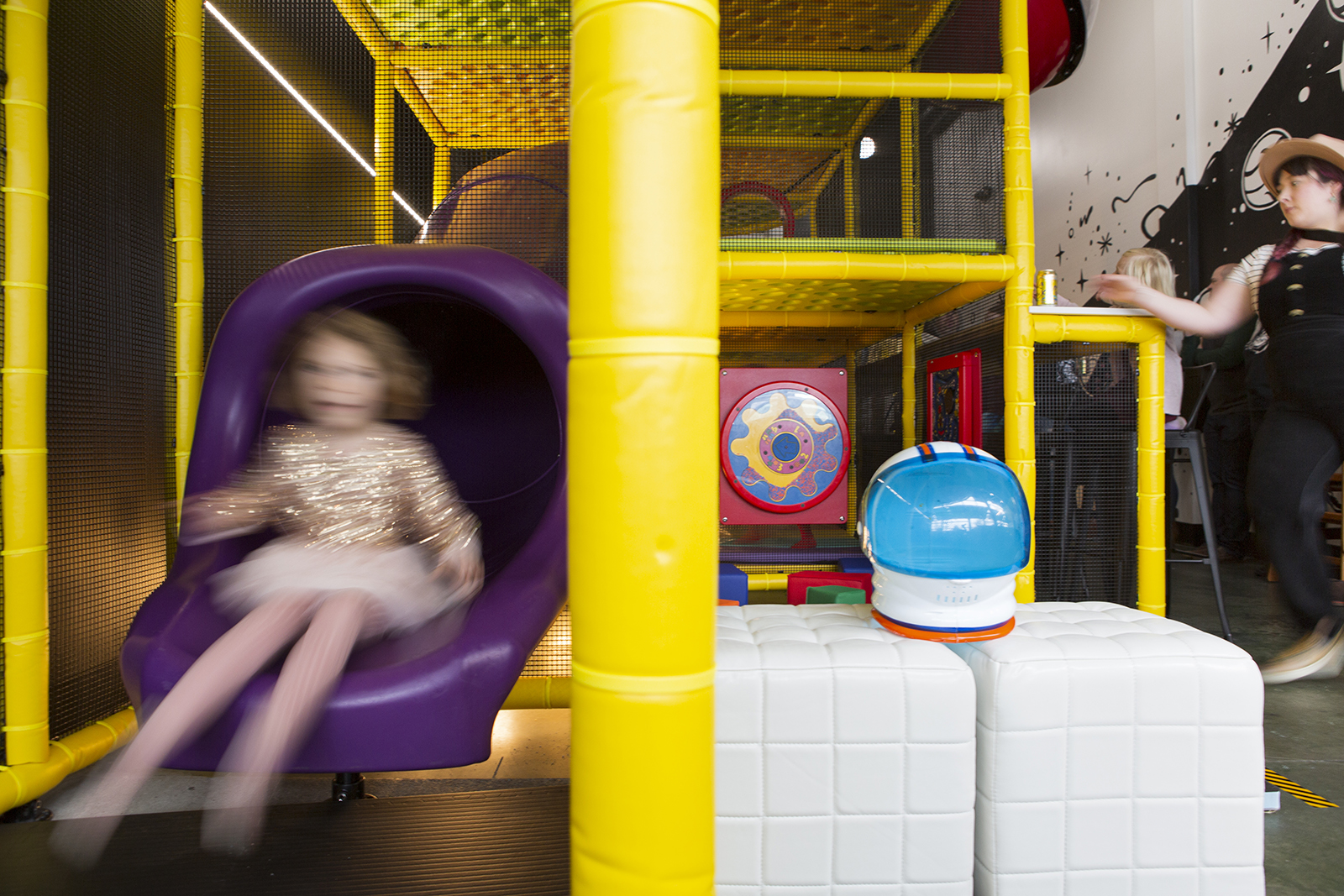 Seven days a week (Monday-Saturday is available for open play; on Sundays, the space can be rented for parties) Outer Space can accommodate 49 people. This may seem like a small number, but Huertas stressed the importance of comfort during play, instead of kids being tightly packed into a chaotic atmosphere. A lower head count makes it easier to keep an eye on the kids from the sidelines, freeing parents to relax and chat while their children play. Fewer kids doesn’t eliminate germs, however, and Huertas is mindful of the need to keep the equipment clean. The space will be cleaned throughout the day, with more thorough cleanings every night and deep cleanings monthly.