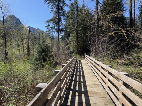 After exploring Oxbow Loop, consider driving another 4.5 miles to the Middle Fork Snoqualmie Trailhead. This vast network of trails contains over 12 miles of hiking trails, but even if you’re done hiking for the day, you can still stop by for a quick splash in the river. A 2-minute walk from the Middle Fork parking area (Discover Pass required) will take you to a gorgeous pedestrian bridge spanning the river. Pause for a photo op on the picturesque bridge, then cross over to walk down the bank to a pebbly beach. The riverside beach is a great spot for a picnic or wading in the frigid water – just keep a close eye on little ones near the water since the river can run very fast during peak glacier melting season.