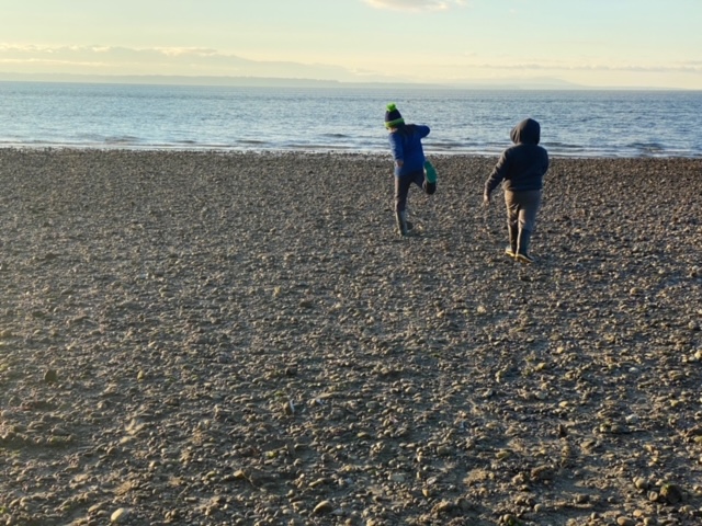 We explore the rocky side of the beach and cross the river, stepping on barnacles, shells and rocks covered in dried seaweed. We throw smaller rocks into the sound, practicing our skipping skills. We climb over logs that have been washed ashore and marvel at one particular log that balances on its roots and a single branch. We’re sure the old tree has many stories to tell.