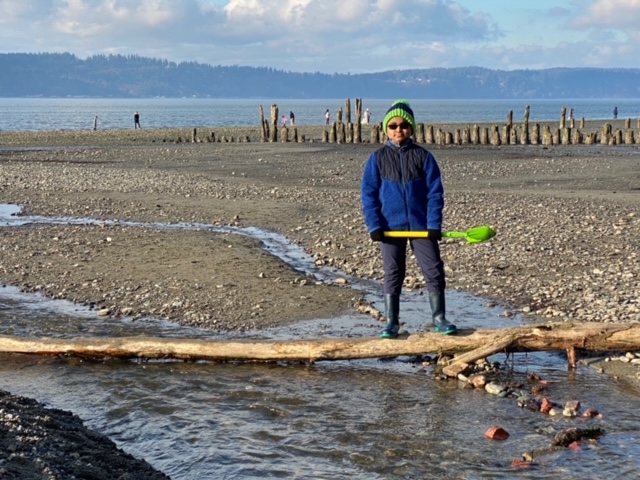 Crossing through a river that divides the two (rain boots came in handy here!), we feel the cold water rush over. We walk on the sand, finding a secluded spot to settle down, not too far from the rocks in the river and close enough to Puget Sound to collect water for sand castle and moat building.