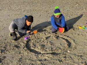 Our excursion has us dressed in heavy clothes, towing shovels, sand buckets and plenty of snacks for some late-afternoon playtime. My sons, Nikhil, 9, and Simon, 7, march up a long ramp to a pedestrian overpass. Fences on either side make it easy to watch trains pass underneath. The boys watch while I take in the amazing island views on the other side. We head down the next ramp to a picnic area and then hop down and across a few logs to the beach.