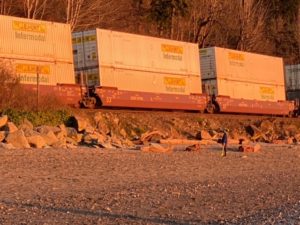 Digging holes and setting up the foundation for what they call “the mega-castle,” my kids scoop the wet sand and place it in molds. “Wait, I see a train!” said Nikhil. Running by the shore, a two-engine freight train comes barreling down, carrying loads of coal and other supplies, hauling them down and out, along the line. Both kids run along pumping their arms, begging to hear the train’s whistle. This won’t be the only train we see this afternoon, and they try again later to encourage the train engineer to blow the horn.
