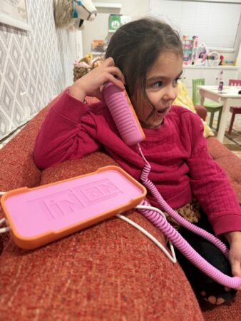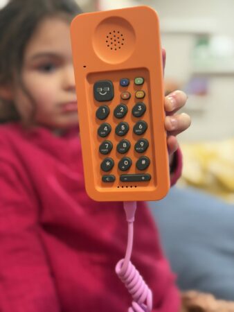 You may laugh, but my daughters had no idea how to physically handle Pinky’s handset. They would position it upside down, away from their ears and mouth or, my personal favorite, out in front of them like they were on FaceTime, only to feel utter confusion as to why they couldn’t hear the person on the other end.