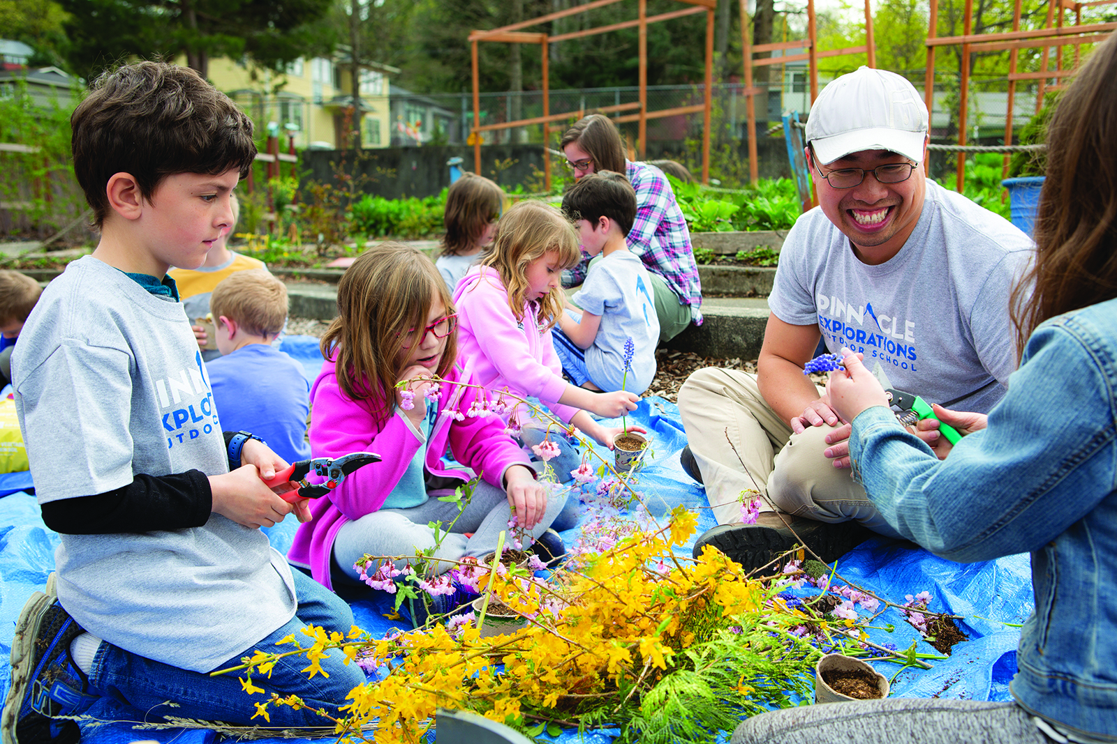 Sean Chan, founder and executive director of Pinnacle Explorations Outdoor School, a nonprofit educational organization based in Seattle, leads a group of eager students, ages 5 to 10, to the Washington Park Arboretum, less than a half-mile trek from their classroom in Madison Valley. His class has been conducting science experiments to learn about water, buoyancy and density; today, they’re excited to test their handcrafted rafts made of fallen tree branches and rubber bands in the arboretum’s streams.