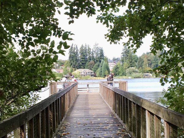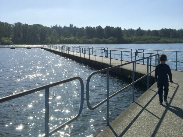 With so much to do, it’s hard to know where to start! The long U-shaped fishing pier ends next to the two-story pavilion, an excellent spot for lunch (Ivar’s, Kidd Valley, or bring your own snacks). Walk past the boat launch to reach the sandy swimming beach. The playground is bigger than most, with some inclusive features and lots to climb. Check out the sand volleyball courts, tennis courts, and horseshoe pits for more fun.