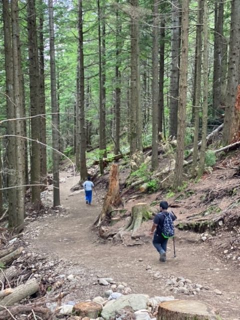 Staying motivated:Ā Heading into this 2-mile hike, my kids and I knew this would be an uphill (literally) challenge. We hadnāt done many hikes with an elevation gain of 1,174 feet, so we stopped many times to rest. The kids and I played games along the way and counted the rings on fresh-cut tree stumps, while catching our breath.