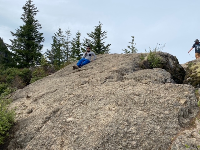 Heading up the first hill of Rattlesnake Mountain, we stopped to take a look at huge boulders placed to the side of the path, called greeter rocks. And boy did they welcome us, standing tall and grandiose. We attempted to clasp our arms around the boulder to see if we could reach the other side, but we’d need at least four more arms to cover the distance. After, my kids climbed on nearby stumps, facing the rock, to take in the sheer size of the immense boulder.