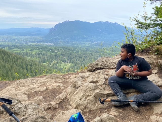 Proud of ourselves, my boys and I high-fived each other and took in the view from the ridge. It was breathtaking. Surrounded by forests of evergreen trees and views of adjacent mountains, we stood and took a peak down to the forest green-colored Rattlesnake Lake.