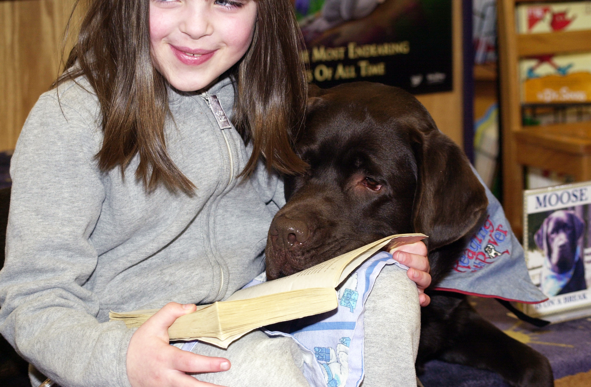 Dogs of all sizes and colors are flopped down on the floor at the Borders bookstore in Redmond. Each pooch lies passively while a child sits a few inches away hunched over a book, deciphering words aloud, and pointing out pictures to their patient canine listeners. Every now and then a tail wags in encouragement and a furry head lifts up to hear a little better.