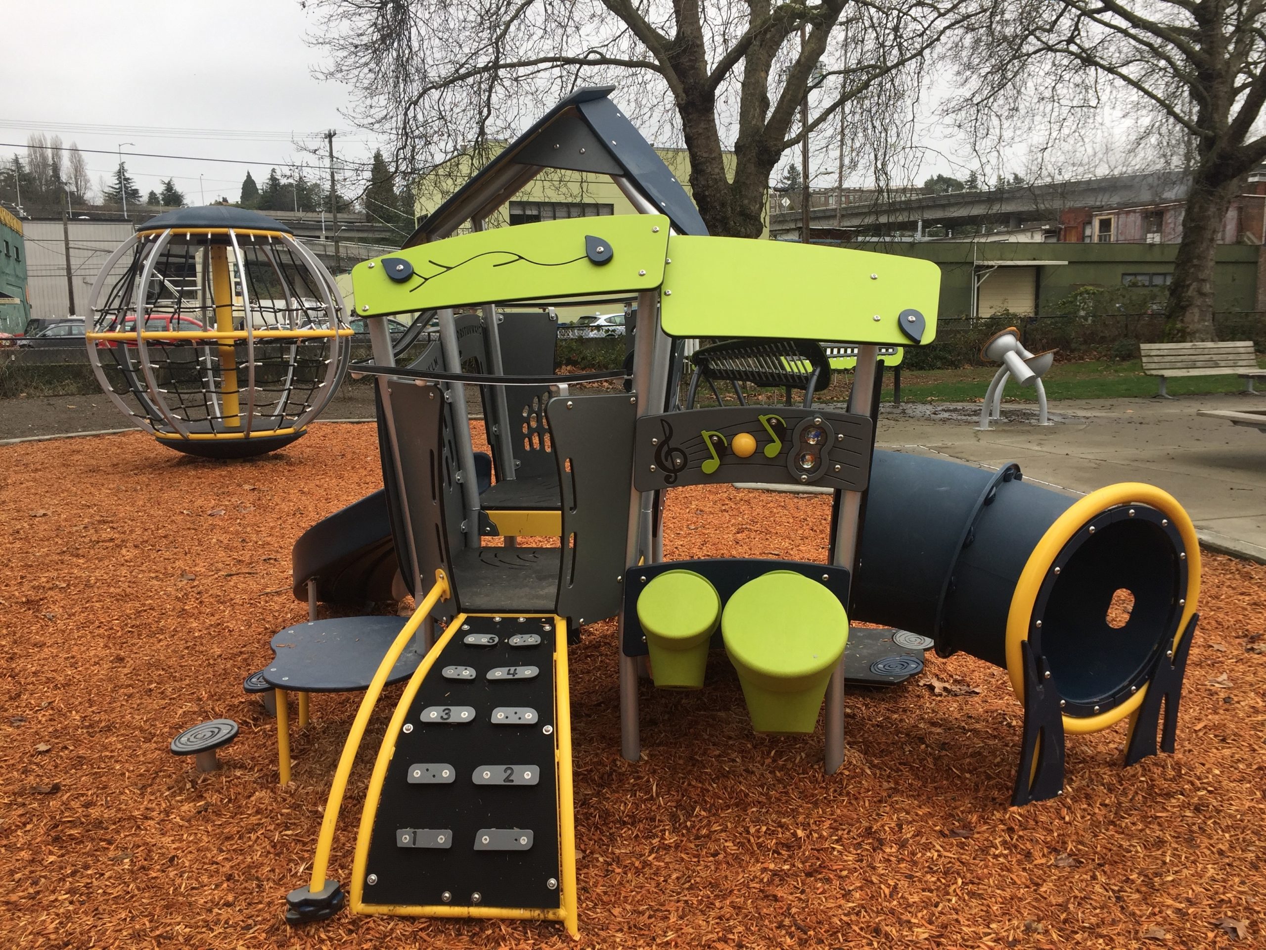 The play area is officially open—adjacent to the spray park in the Northwest corner of the park—and it is state-of-the-art. It features an airplane-themed composite deck and rope climbing structure for children 5 to 12 years old, a smart play structure for children 2 to 5 years old, exciting rotating play equipment and even a fun mosaic band circle including a drum, chime and xylophones.