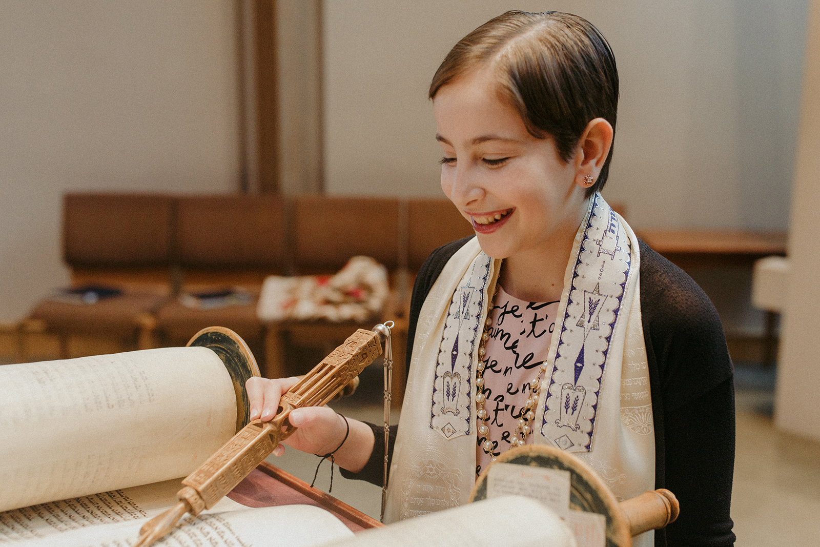 On her bat mitzvah day, Sadie wore a formal dress and a special tallis, the traditional Jewish prayer shawl.