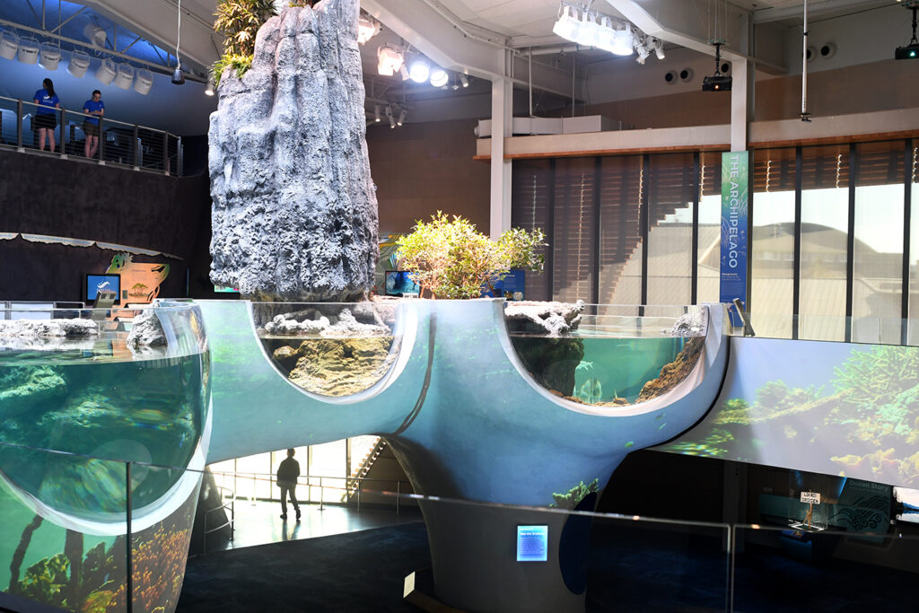 From the second floor, the archipelago and coral tanks are open and at waist height. It might be tempting to reach over the thick acrylic wall but remember, these are not touch tanks, and it’s a long way down if you go for a swim. (The touch tanks are all in the old Aquarium building.) There is, however, faux coral for you to feel in a nearby display. Faux coral is surprisingly rubbery and functions the same as natural coral, as a habitat for fish.