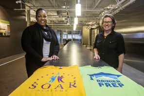 Steve Ringman via The Seattle Times "Kristina Bellamy-McClain, left, with the name of the school she hopes to found in Tacoma — Soar Academy. Maggie O’Sullivan, right, would like to run a school in the Highline school-district area called Rainier Prep." |