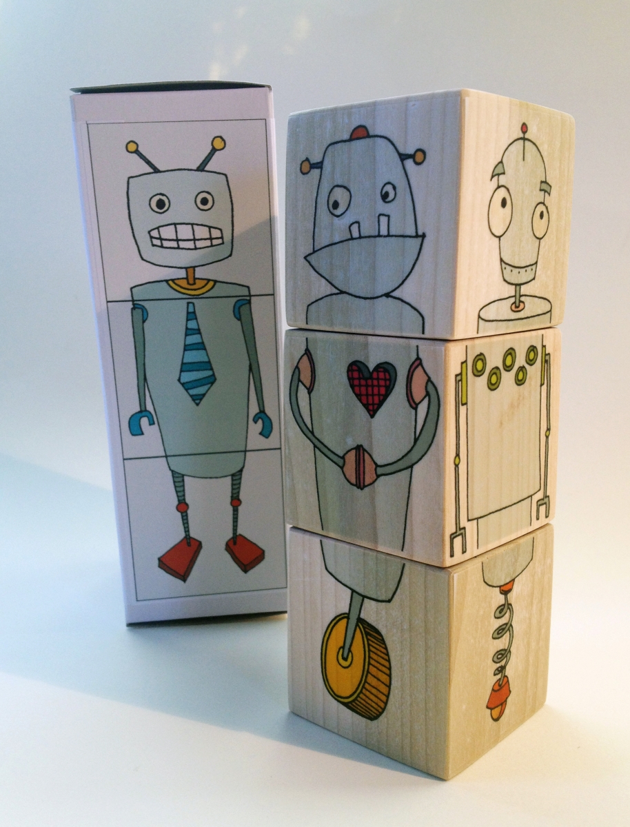 In a toy landscape filled with plastic parts and batteries, flashing lights and blaring sounds, Red Umbrella offers a wry take on the basic wooden building block. Each set of three handcrafted blocks has robot parts painted (and sealed with natural, nontoxic shellac) on each side, so that as you stack, a mix-and-match robot comes to life. $32, redumbrelladesign.com