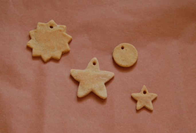 On a well-floured surface, roll out the dough to no less than ½ inch thick. Cut shapes with cookie cutters and poke a hole in top of each shape with a straw. I recommend moving each shape to a greased or lined baking sheet as soon as you cut it, because otherwise the dough starts to settle and stick to the surface no matter how well-floured.