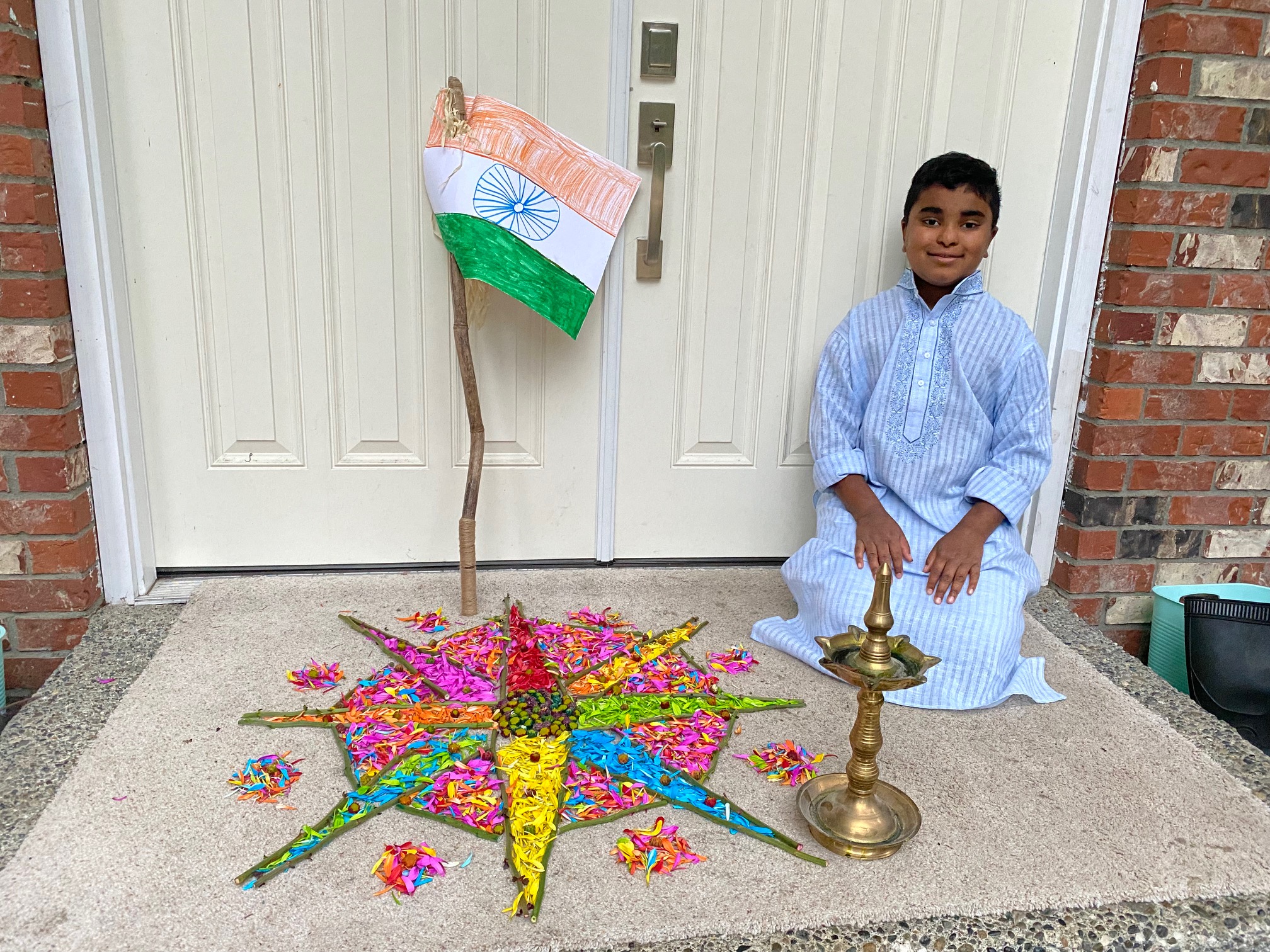 Blessing the house with a colorful rangoli.