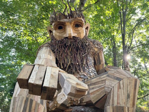 Each troll is handcrafted using reclaimed wood, old pallets, and foraged items like orchard clippings or salvaged rope. They’re built with the help of local volunteers — teachers, artists, and even yoga classmates.