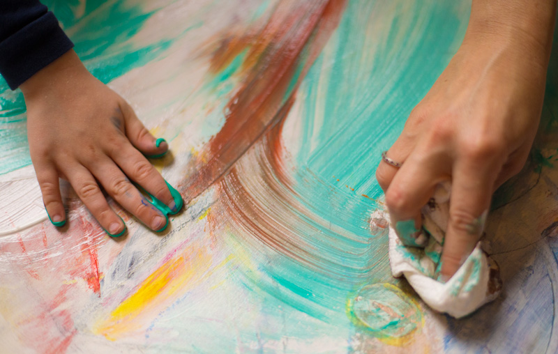 3. Paint. Everyone go for it! To keep colors clean and vibrant, dedicate one brush per color or give the brush a quick wipe with a paper towel before dipping it into a new color. Experiment mixing colors on the canvas using the brush, a wadded-up paper towel, even hands or feet. When you are all happy with the painting let it dry completely. You can keep adding to it after it dries and for a white-washed look, rub a light layer of white paint over the entire painting.
