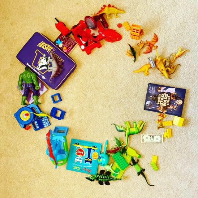 Quick pick: Make a found object color wheel! Learn about rainbow order, as well as primary, secondary, and even tertiary colors. Then, go around the house collecting objects of all colors, and putting them in order in a circular pattern on the floor. Now you have a beautiful, rainbow visual aid!