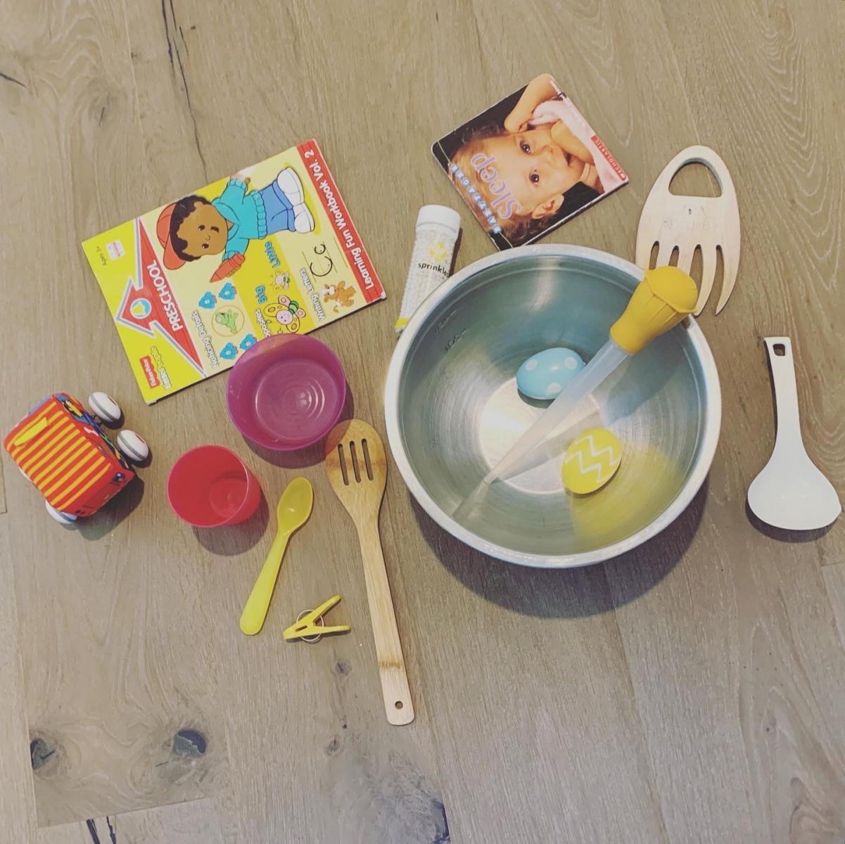 Quick pick: Mystery sounds! Set up a corner of your house with a few items you already have lying around, like a mixing bowl, spoons, a salt shaker, a board book, a few toys, etc. One person stays in the musical corner, creating an interesting sound out of two objects, and the others hide out of ear shot. Then, the other players return and try and guess which two objects made the mystery sound!