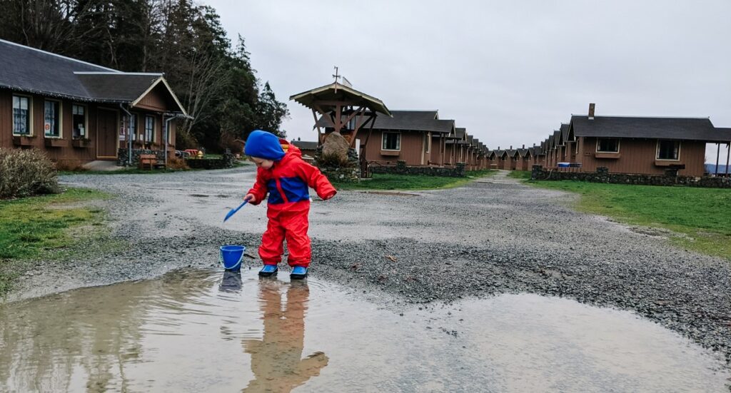 Another amenity: puddles! And this is a nice overview of the cabins at Cama Beach State Park.