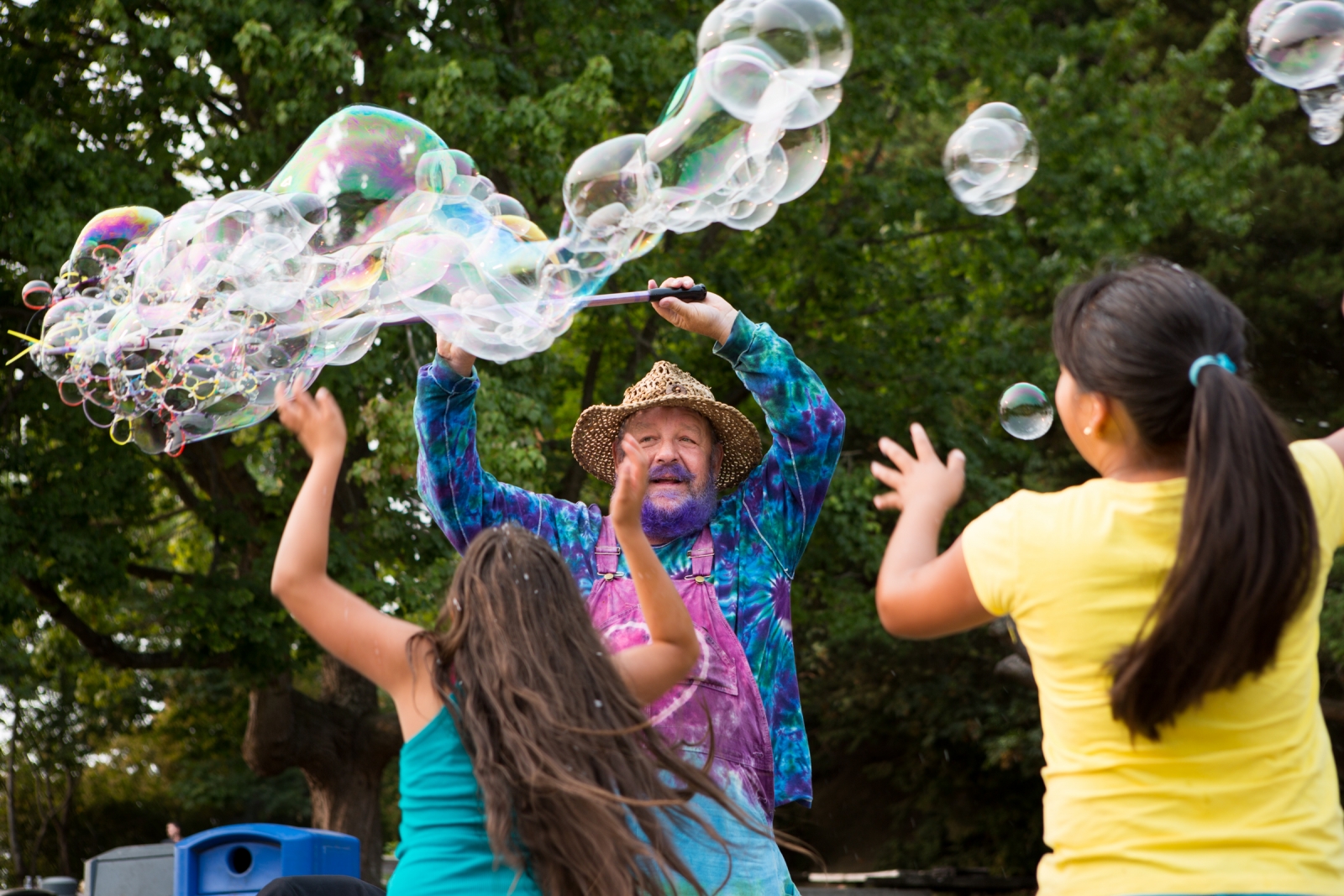 Photo: Joshua Huston Bubbleman showing off great bubbles to a crowd. |