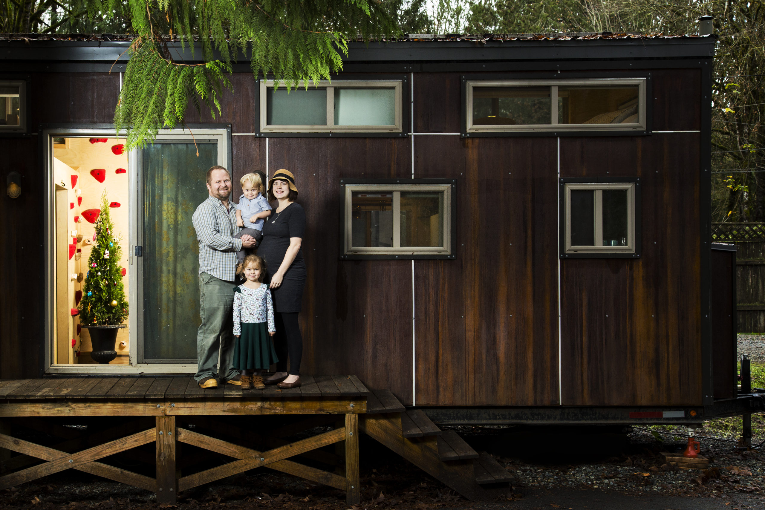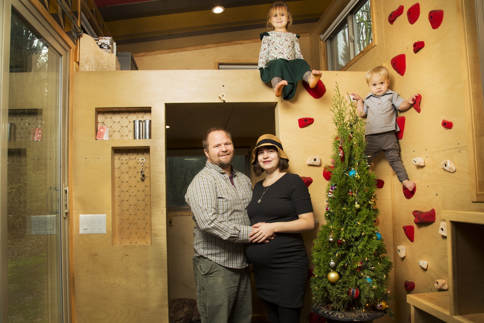 Baylie and Bjorn Carlson are doing it tiny. The couple and their two small children (with one on the way!) Freyja, 4, and Ogden, 2, live in a 204-square foot, 24-foot-long “tiny house” that is currently parked in Olympia, an hour south of Seattle. Consisting of two lofts, which serve as their family bedroom and office, and a living room, kitchen, bathroom and shower, the house weighs about 12,000 pounds. It’s on wheels — able to be hitched and hauled just about anywhere — and currently has clocked about 8,000 miles.