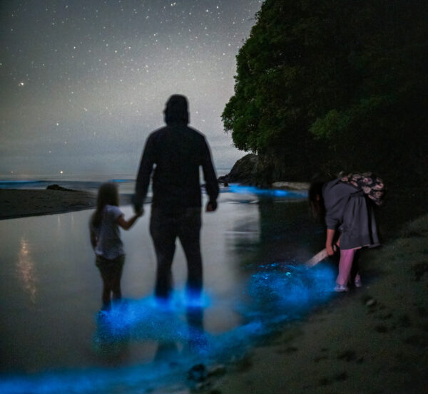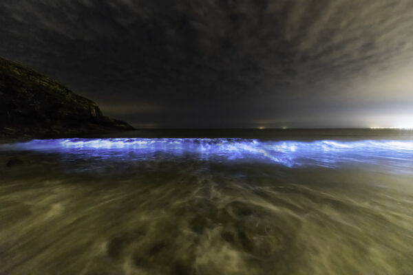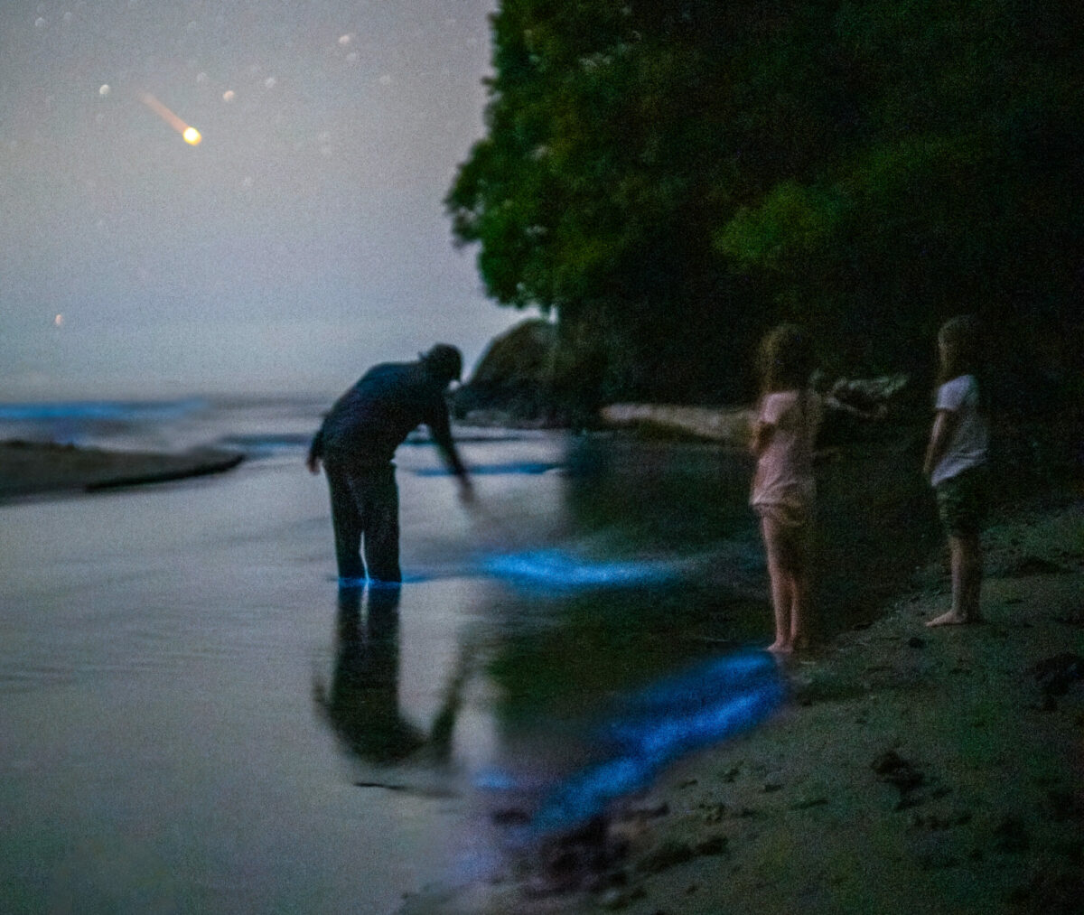 Sometimes, bioluminescence can also be found on shore as the tide recedes. Use a stick to scrape sand near the tide line or lift clumps of seaweed to see if little blue sparkles are emitted.