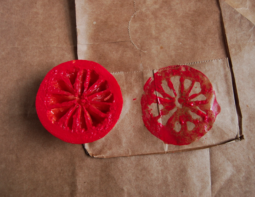If you’re using a juicy fruit or vegetable, try to squeeze some of the juice out before using it to stamp. The first time you use it the paint might be a bit runny, but blotting it with a paper towel or dotting it on the scrap paper should dry it up.