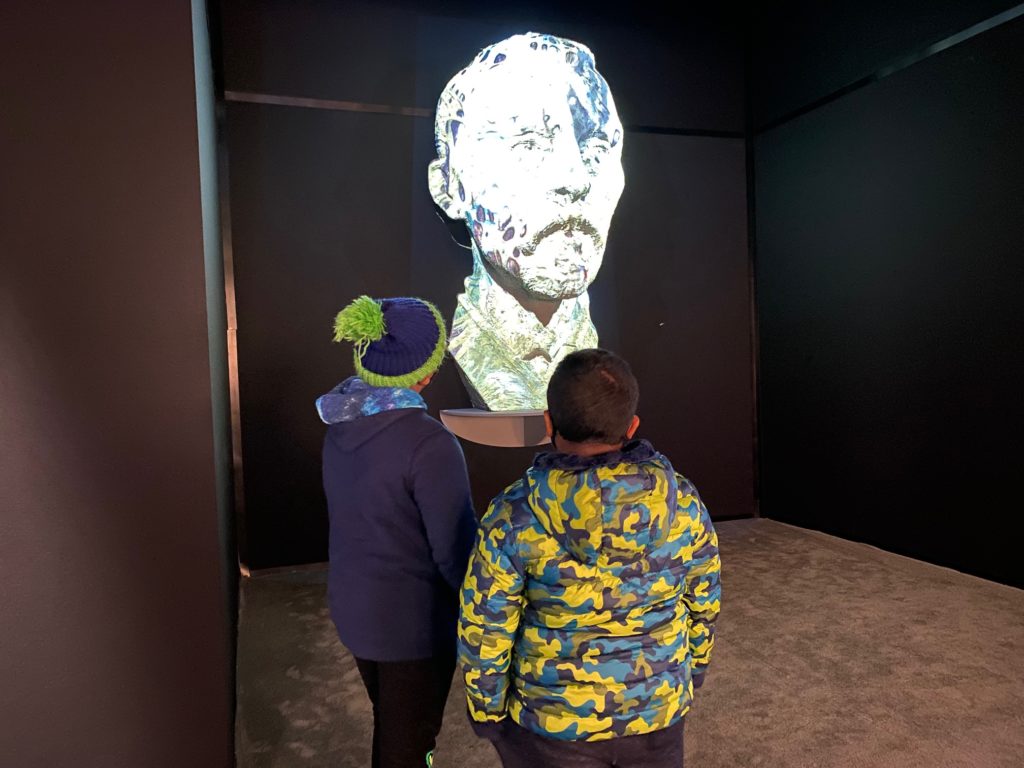 My kids were drawn to the more interactive and immersive exhibits. Stand in front of a sculpted bust of the artist’s head and watch as a projection of colors make up Van Gogh’s face. “This is so cool!” was proclaimed a lot during our visit.