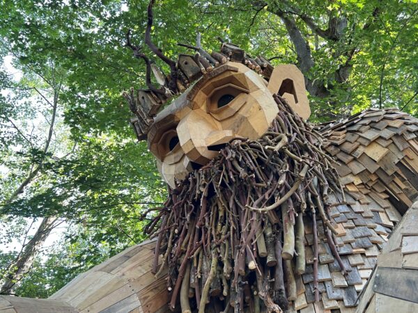 The birdhouses built for each troll in this exhibition are made of wood scraps and leftover materials when the artist and his team create the fur and cladding for the trolls, emphasizing the artistās goal of creating sustainable art. Additionally, the artist used social media to request rope strands strung with found natural objects to use as decorations for Oscar The Bird Kingās display. Local residents responded with beautiful strands made from driftwood, shells, feathers and stones. Those rope strands now flow from birdhouse towers that surround Oscarās throne.