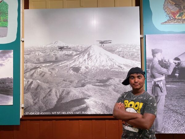 A photograph of Mount St. Helens, pre-volcanic eruption, surrounded by planes is a memorable image along with many types of weapons used by American soldiers as well as soldiers from different countries.