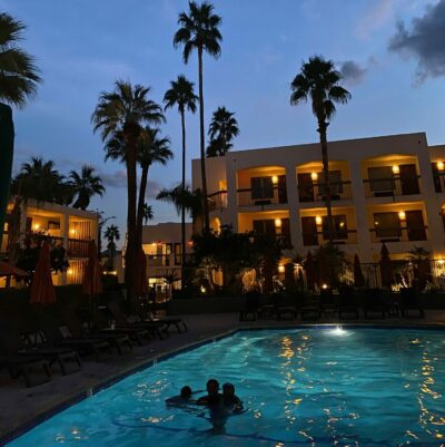 Packing for Palm Springs can be tricky and depends on your activity level. My kids are 10 and 12, and we packed extra swimsuits, comfortable walking shoes, layers for hiking, hats, and sunscreen. Boots and hiking sticks were also helpful and fit snugly into our carry-on.